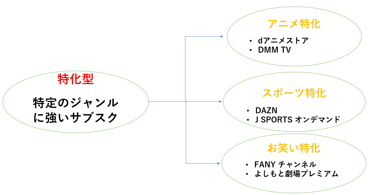 代わりに、対象ジャンルの作品数が非常に多く、ほかでは視聴できないマイナー作品などを取り扱っている傾向にあります。上の図でも示したとおり、主に以下のサブスクが特化型に分類されます。