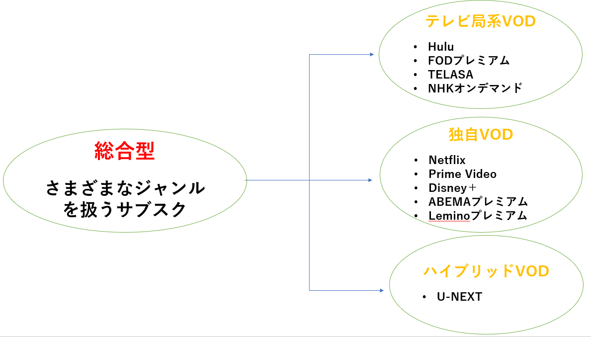 動画サブスクは配信作品のジャンル・充実度などに応じて、主に以下2種類に分類できます。